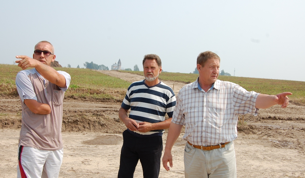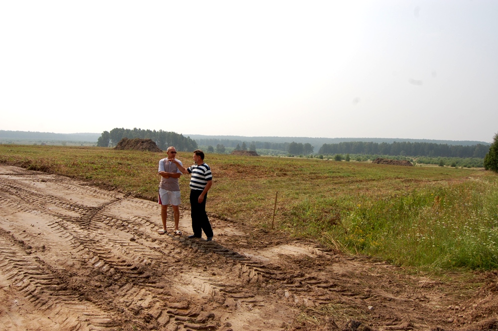 На фото (2): Председатель Фермерского поселения "Великово" Сергей пригласил специалистов проектног института "Ковровмашпроект" для осуществления авторского надзора. Необходимо сделать точную разметку границ водоемов, которые должны иметь форму фасоли или бумеранга. Необходимо создать 8 водоемов, каждый объемом не менее 5 тысяч кубометров.