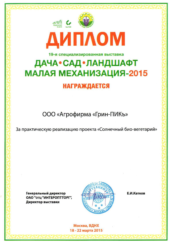19-я специализированная выставка «Дача. Сад. Ландшафт. Малая механизация – 2015» Диплом за практическую реализацию проекта "Солнечный био-вегетарий"