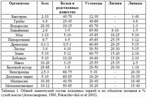 Общий химический состав червей показан в сравнении с теми растительными остатками или навозом, которые используются в вермикультуре как субстрат (Табл.1).